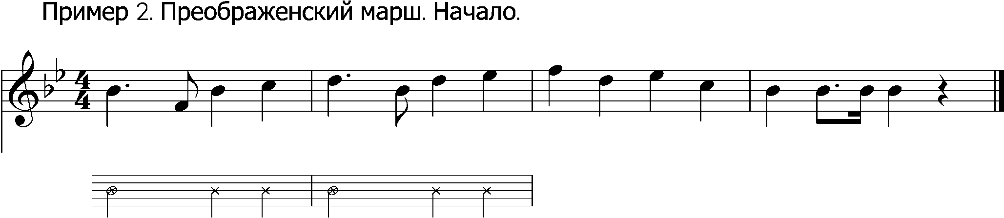 В связи с панегирическими кантами Ю.Келдыш (там же) упоминает Преображенский марш, но не видит его сродство с хором Глинки. Речь идет о ритмоформуле, показанной в нотных примерах 1–5. ↩︎
