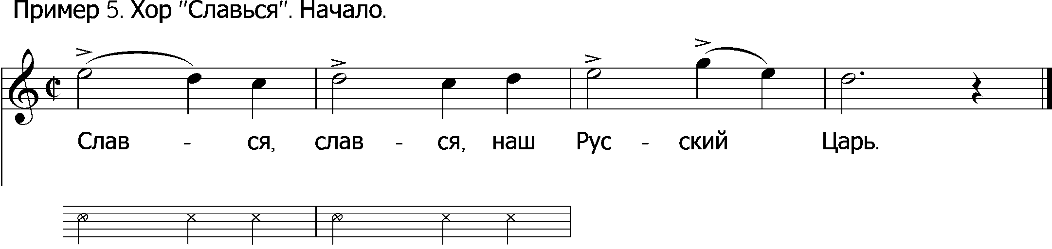 в) Рассмотрим вкратце музыкальные особенности хора «Славься». Как это в истории музыки часто бывает, гениальные произведения возникают не вдруг, а на основе достижений многих предшественников. Славильные канты петровского времени9, Преображенский марш конца 18 века10, духовная музыка Дмитрия Бортнянского11 — интонационные предшественники Глинки в данном случае.