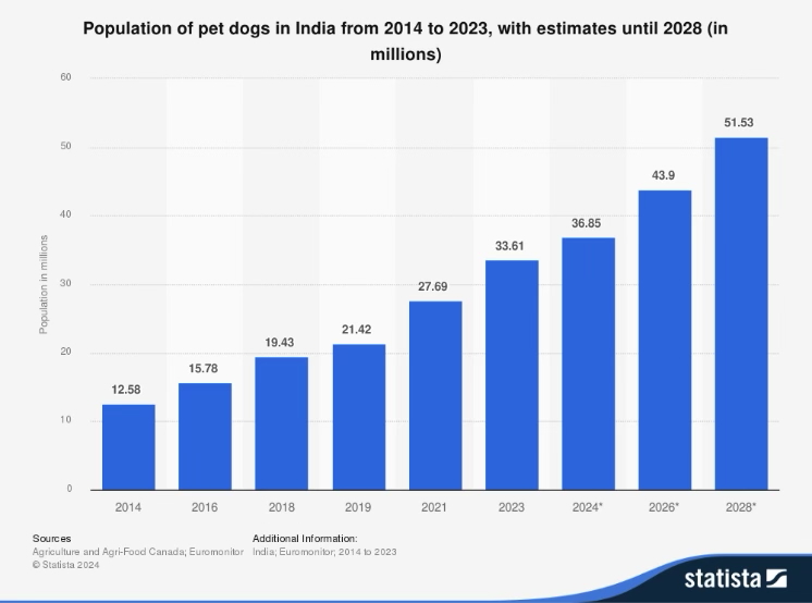 India: population of pet dogs 2028 | Statista. (n.d.). Retrieved April 10, 2025, from https://www.statista.com/statistics/1061130/india-population-of-pet-dogs/.