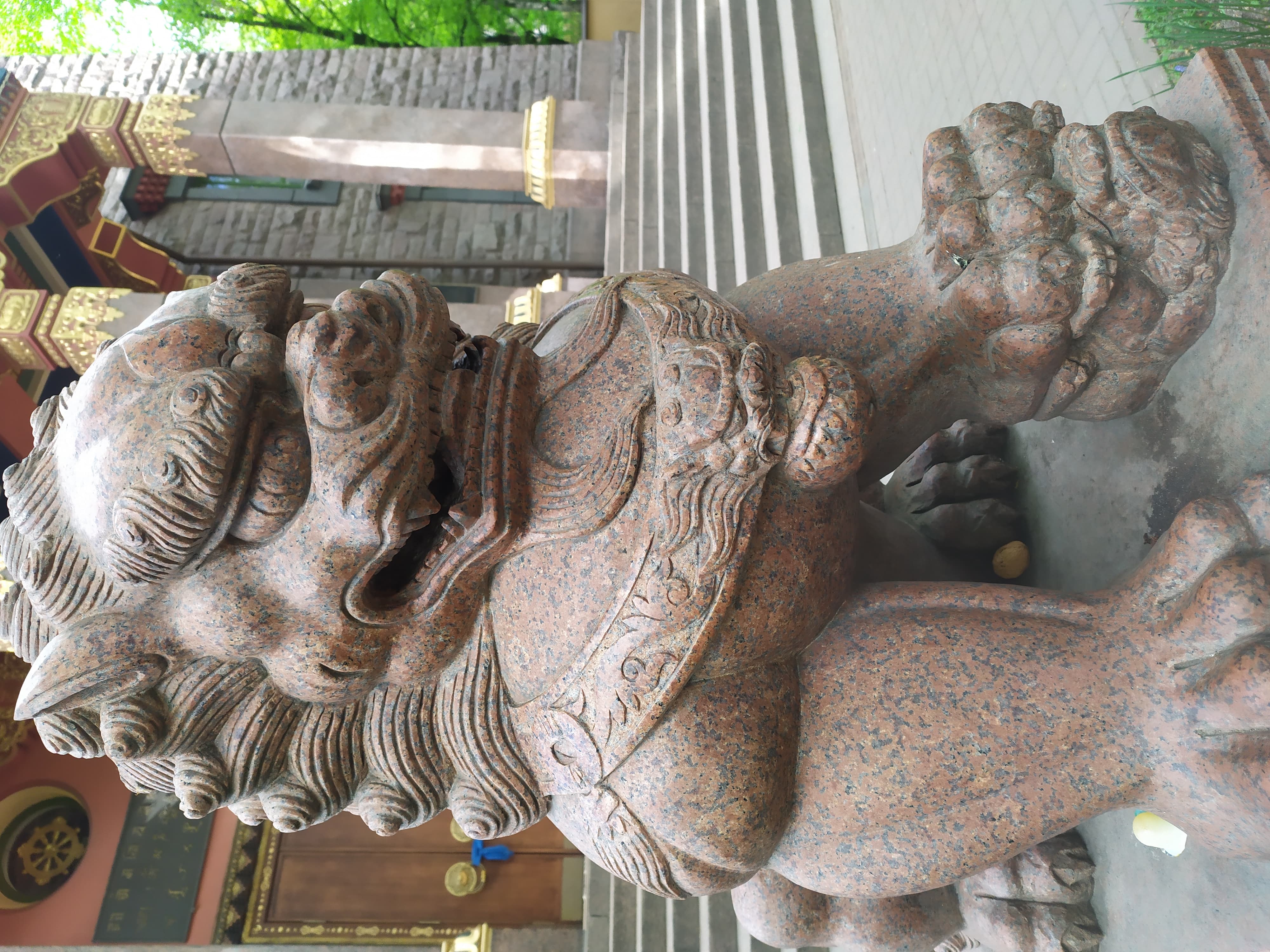 За оградой оживленная улица Савушкина. Не пойму, мне здесь спокойно или нет. Присела на скамейку перед входом. У входа скульптуры львов, символизирующие желания и страсти, которые должны обуревать людьми. Сплошные оскалы, такие львы, конечно, никем «обуревать» не могут. Рассматриваю застывшие «страсти» ближе. У лап льва лежат киндер-сюрприз, две конфеты и пахучая гвоздика. Подношения.  Знак? Зачем задабривать «страсти», если они всего лишь скульптуры?