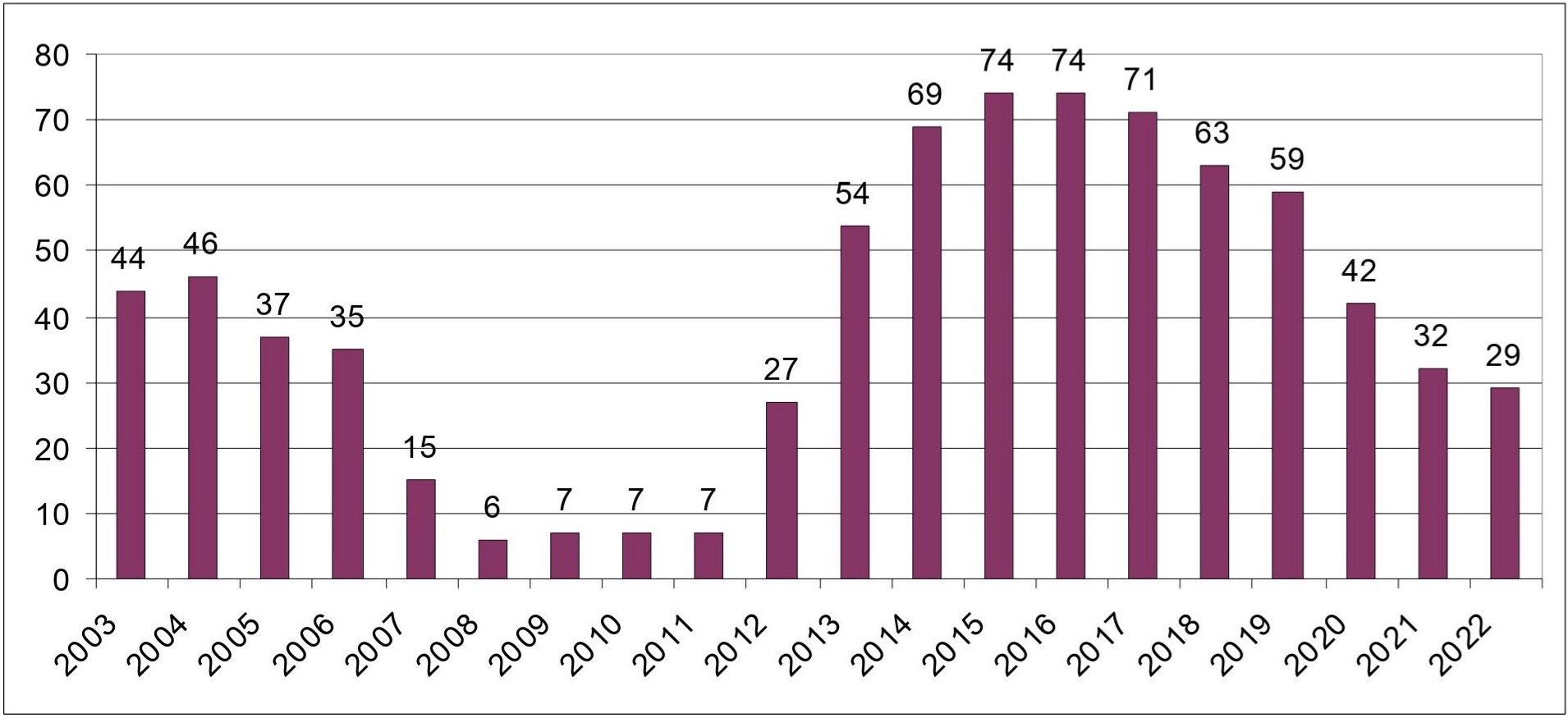 | 2016 | 74 | 14 | 14 |